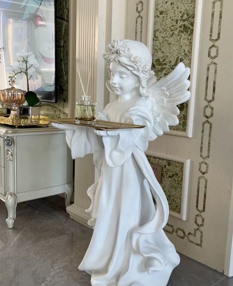 A tall resin angel holding a medium tray — elegant and functional, perfect for displaying candles or decorative items.