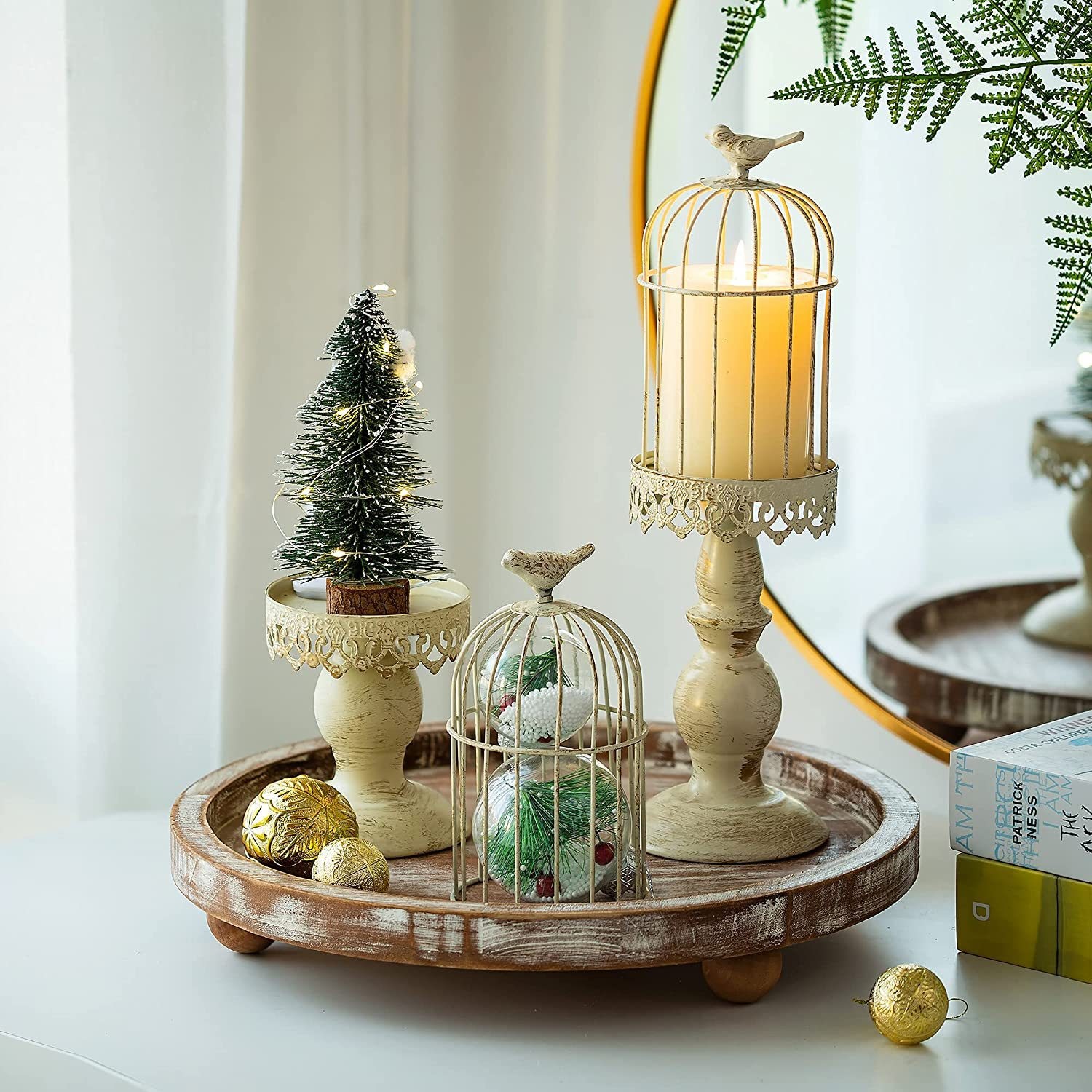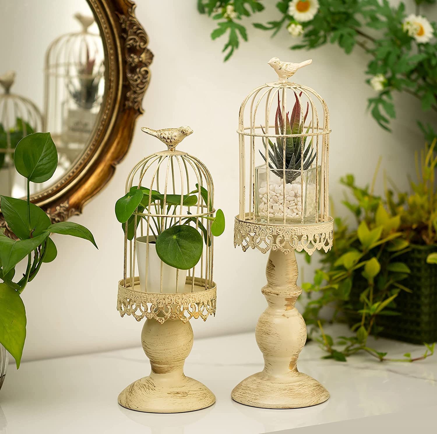 Elegant vintage iron art bird cage candle holder in white and gold, perfect for weddings, Christmas, and home décor